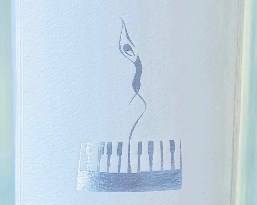 At the center, a minimalist figure rises above a series of piano keys, a quiet but powerful nod to the connection between structure and creativity. It’s a visual interpretation of rhythm and restraint—where every note matters, and nothing is out of place. The keys ground the composition, while the figure adds movement and lift, echoing the energy found in the glass.