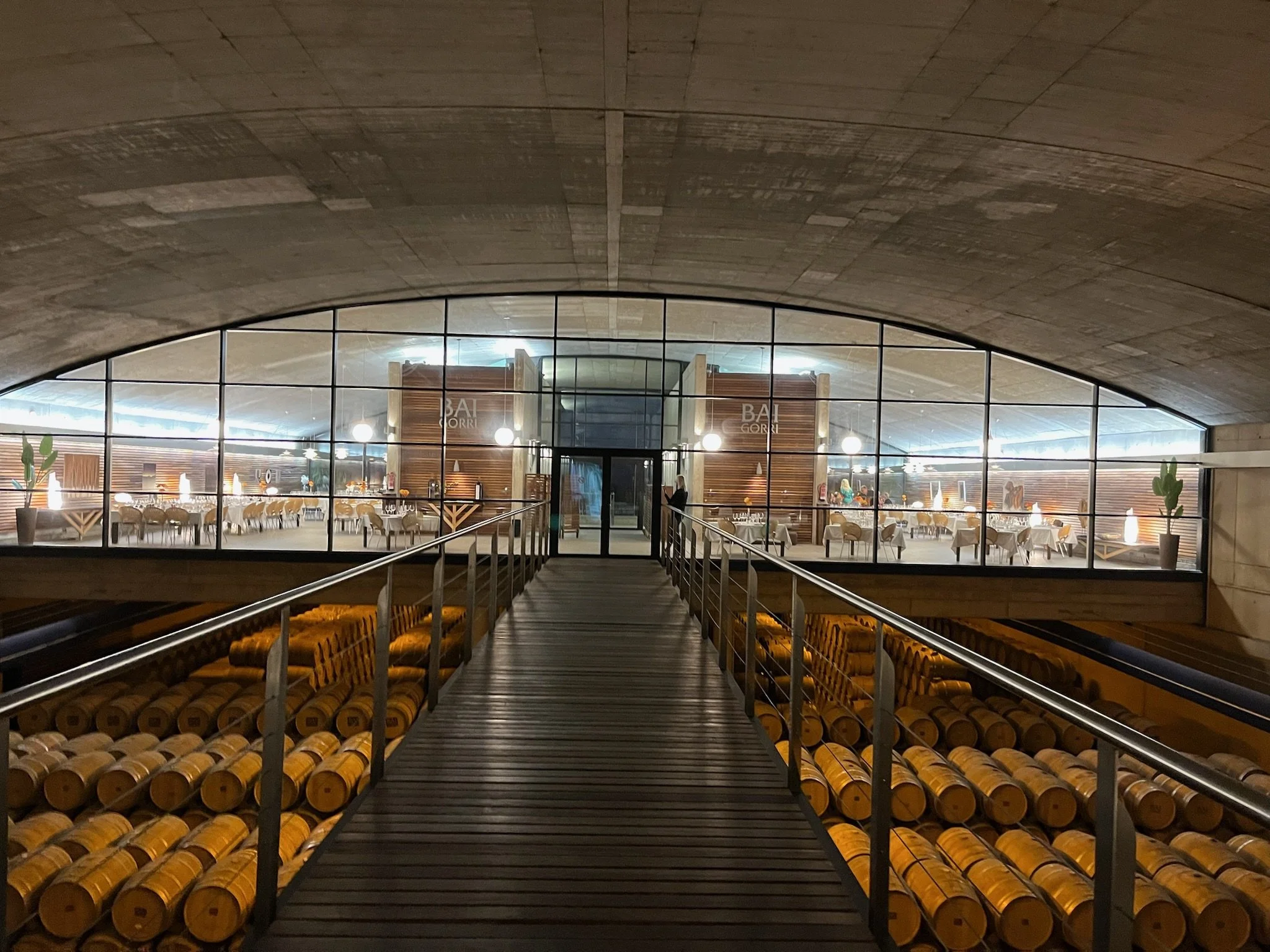 The morning is devoted to Ysios, a winery that looks like a sculpture dropped into the vineyards—sleek lines, sweeping roof, and vistas that stretch to the Cantabrian mountains, all framing a focused, private tasting. Lunch follows at Huerta Vieja, a favorite for its terrace views over the valley behind Laguardia and its generous, deeply comforting Rioja cooking. After a little time to catch your breath, evening takes you to Sola de Samaniego, where dinner unfolds by a glowing hearth and then moves into a massive wine hall. The scale, the stone, the tanks, the music—it’s a night that feels half performance, half dream.