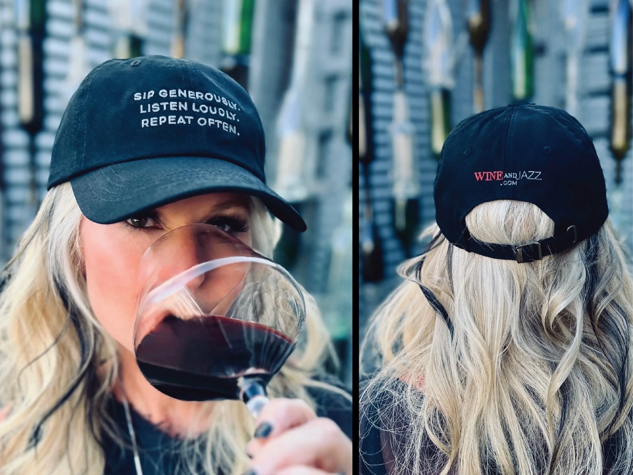 Top off your look with our fresh take on this high-quality cap with our tagline, " Sip Generously, Listen Loudly... Repeat Often". This street style cap also features our signature WINEandJAZZ.com logo as well as an adjustable strap in the back that makes this piece fit for everybody.